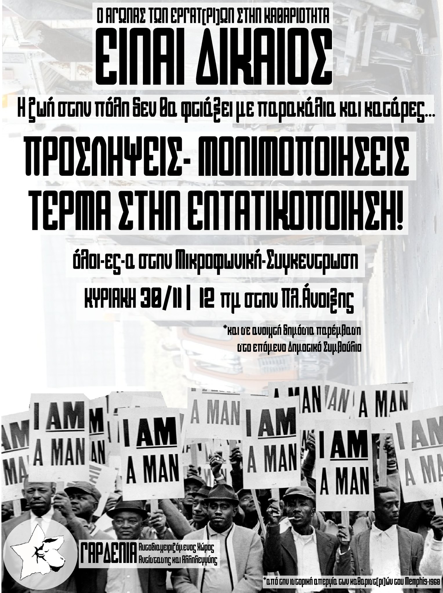 Μετά τις πρόσφατες εξελίξεις με τους δημοτικούς υπαλλήλους στου Ζωγράφου, ο Αυτοδιαχειριζόμενος Χώρος Γαρδένια από κοινού με άλλες συλλογικότητες από του Ζωγράφου και τα Ανατολικά, καλούν σε: